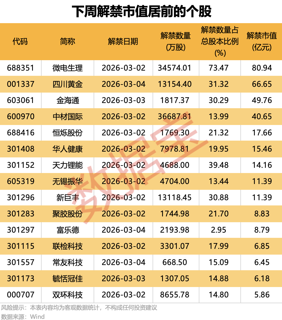 有9股解禁市值超11亿元,其中4股解禁市值超40亿元,分别是微电生理、四川黄金、金海通、中材国际。