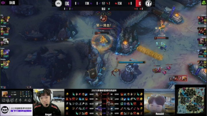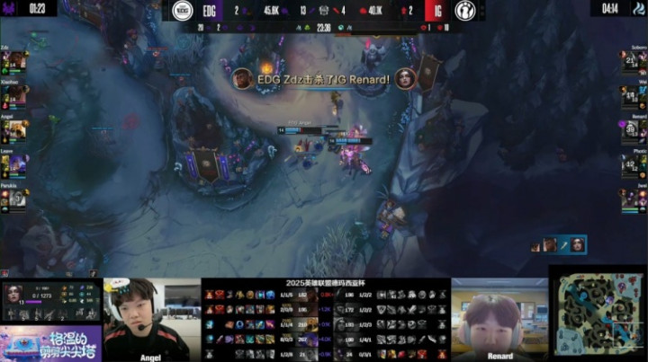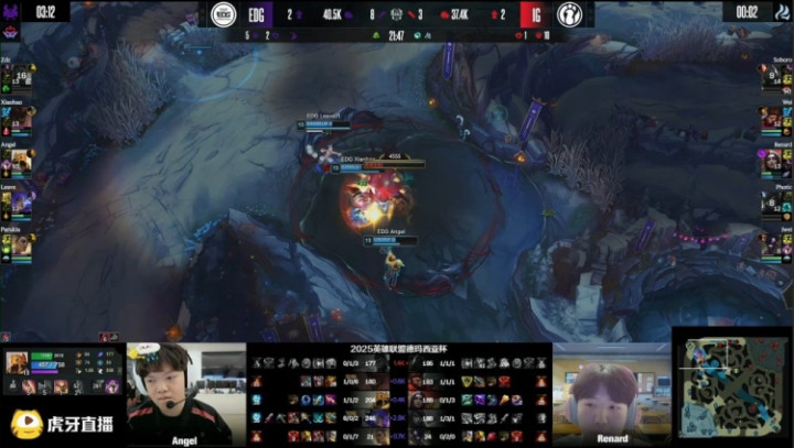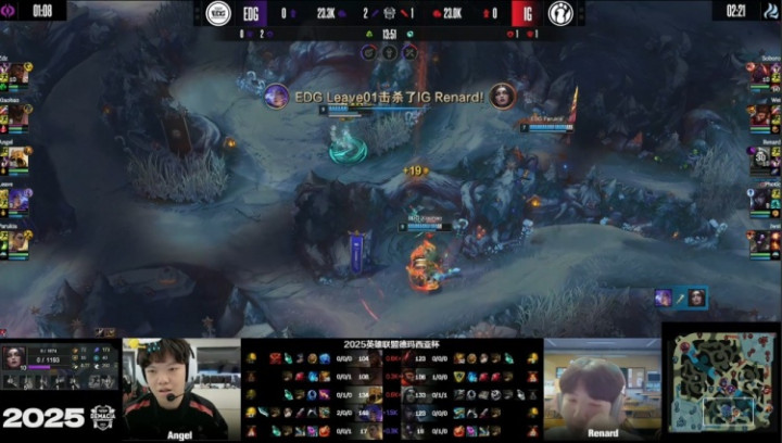 [25:21]中路团战iG毫无一战之力瞬间被EDG打出0换5刷屏团灭,EDG推掉iG中路水晶后吃掉大龙,经济领先1w2k。