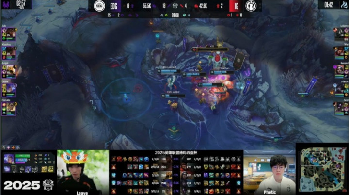 [20:58]上路团战,Wei猴子侧面开大进场先被集火秒杀,正面Leave芸阿娜开大点掉Jwei牛头后再杀Photic厄斐琉斯,EDG打出2换4,回头吃掉厄塔汗,经济领先3k。