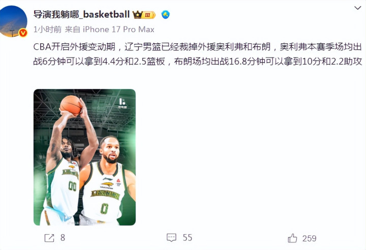 根据媒体人导演我躺哪_basketball报道:“CBA开启外援变动期,辽宁男篮已经裁掉外援奥利弗和布朗。”