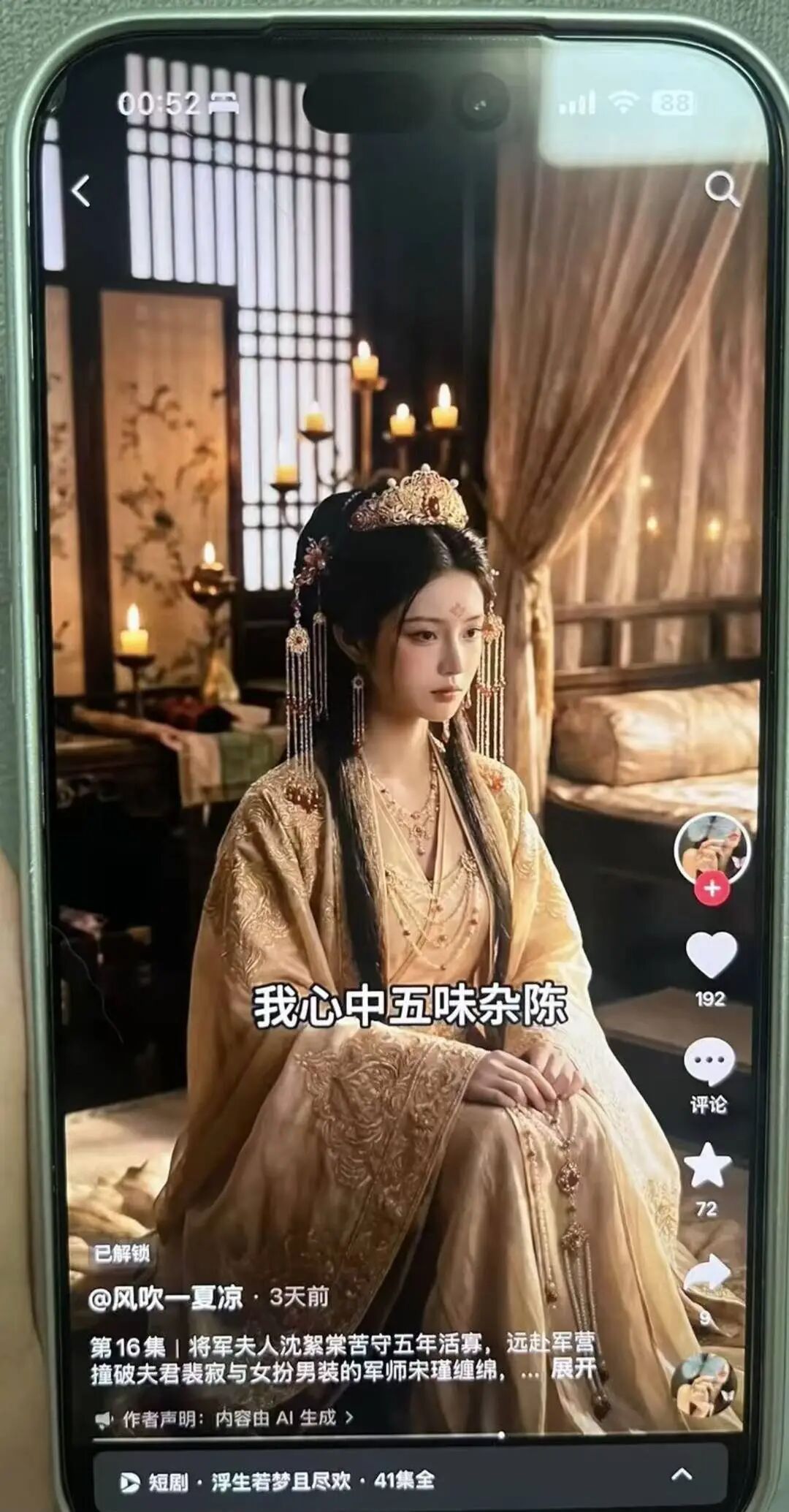 网友等等(化名)介绍,在短视频平台刷到一部《浮生若梦且尽欢》的AI古风漫剧后,感觉内容和真人短剧差别不大,对其产生了好奇。该剧一共41集,看完前面免费的5集后,付费16元解锁了后续剧集。
