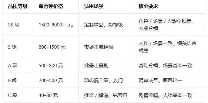 AI漫剧品质等级分类及制作价格(采访业内人士整理)