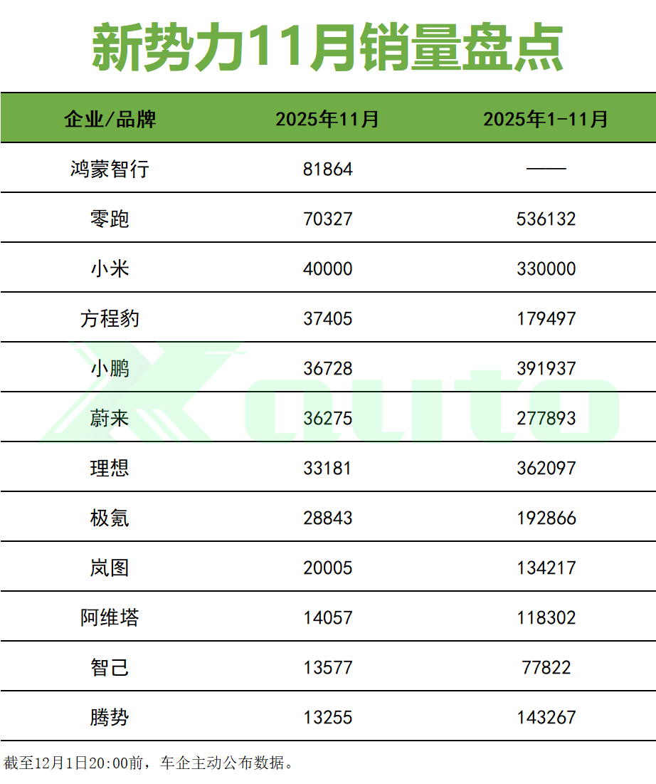 12月1日,部分品牌抢先公布2025年11月数据,截至发稿前,已有12家企业/品牌发布销量数据。