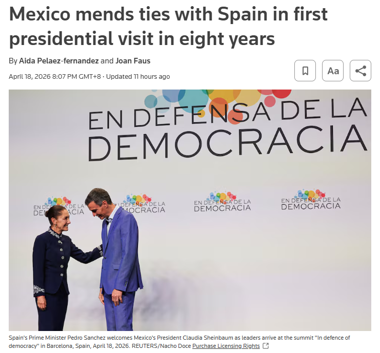 4月18日,墨西哥总统克劳迪娅·辛鲍姆与西班牙首相佩德罗·桑切斯在西班牙巴塞罗那举行会谈。这也是时隔八年墨西哥总统首次访问西班牙,标志着两国此前紧张的关系逐步缓和。此次访问也被视为重启墨西哥与西班牙多年政治对话的重要一步。